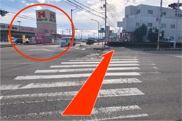 横断歩道を渡り、さらに直進してください。 -