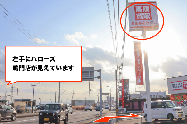 右手におたからや 鳴門大津店の看板が見えてきます。右折しておたからや 鳴門大津店の駐車場に入ってください。 -